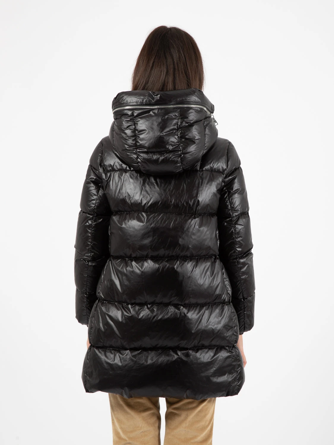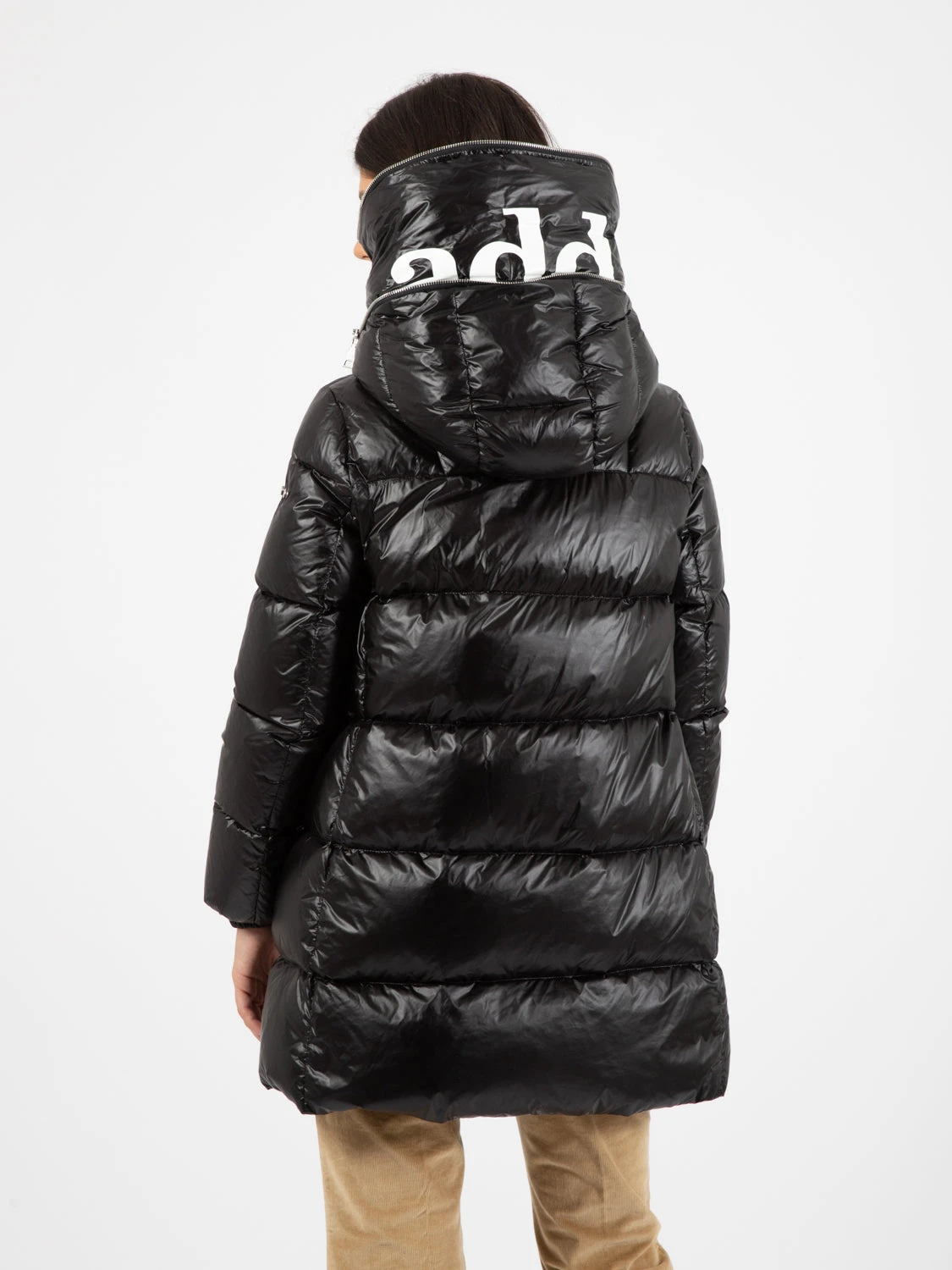 Collo alto con cappuccio apribile e stampa marchio lettering.