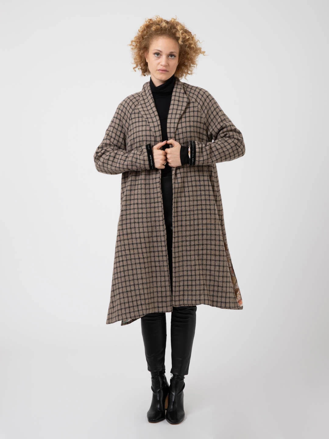 Bavero sciallato corto, maniche lunghe con polsini in velluto logato.