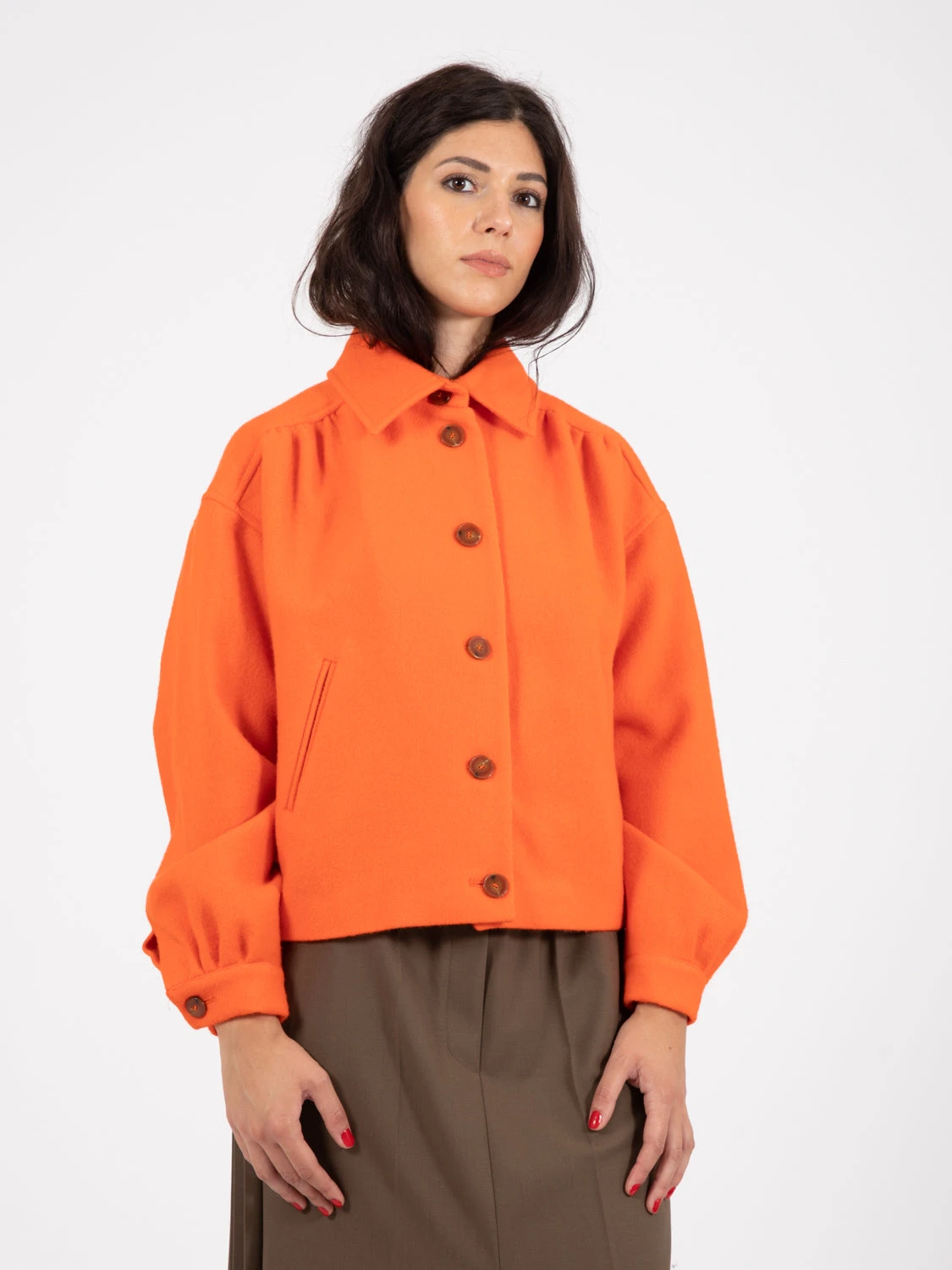 Collo revers e maniche lunghe a palloncino, con polsino e bottone.