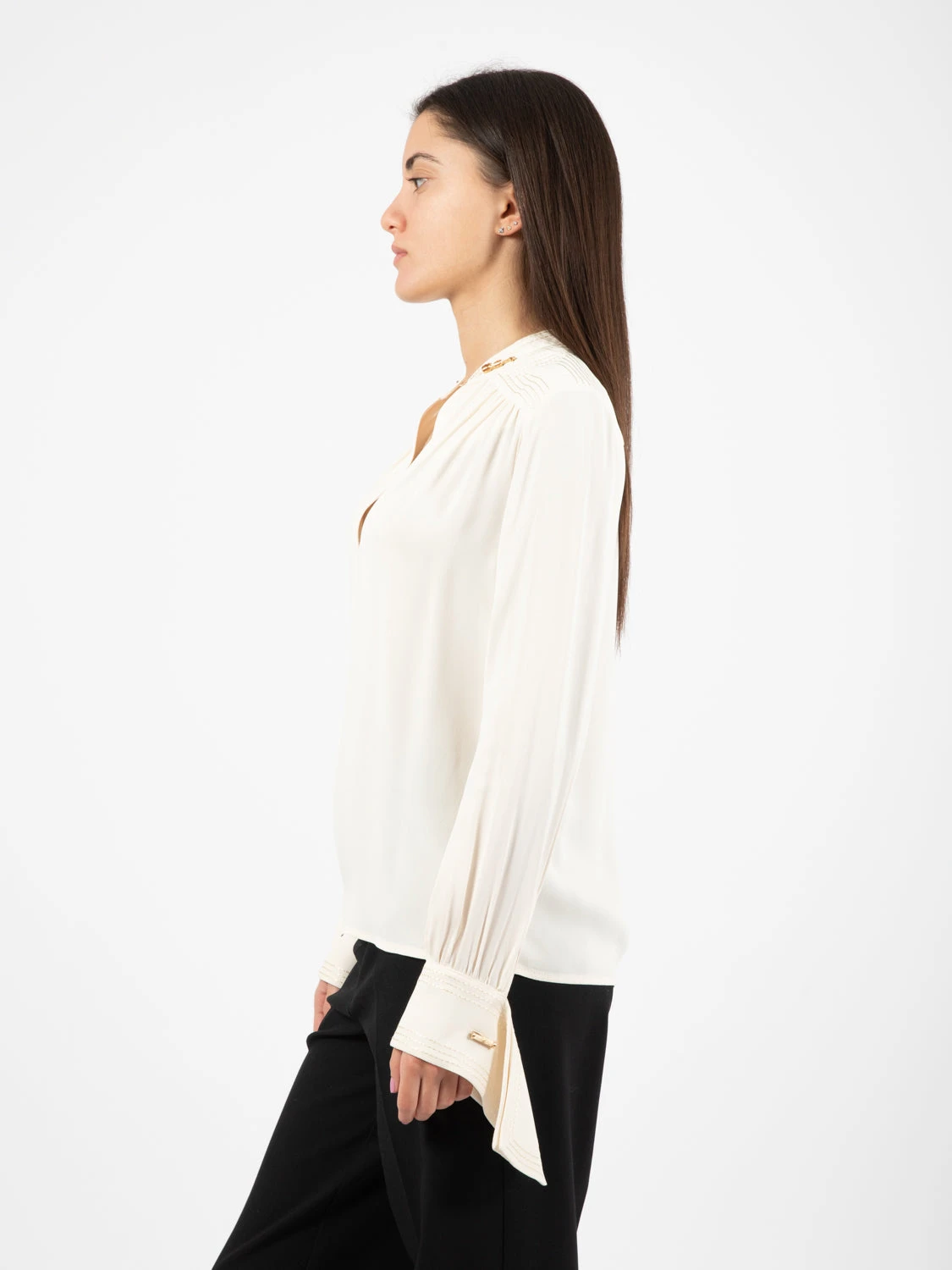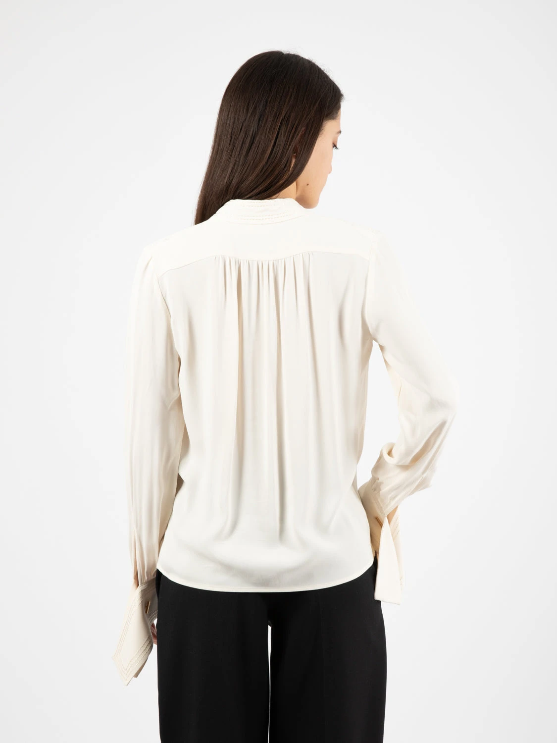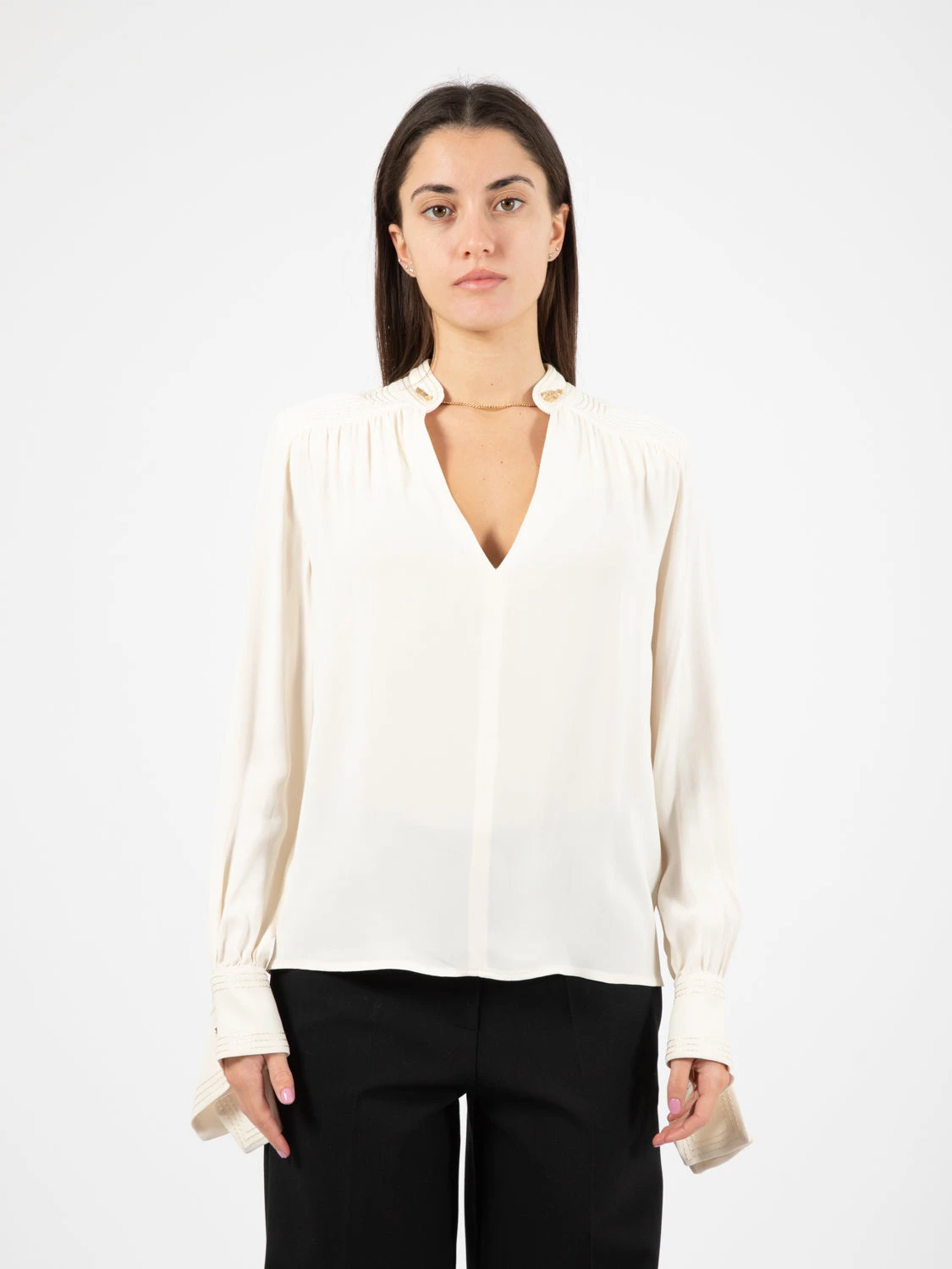 Collo alla coreana chiuso con gemello e scollo a V profondo.