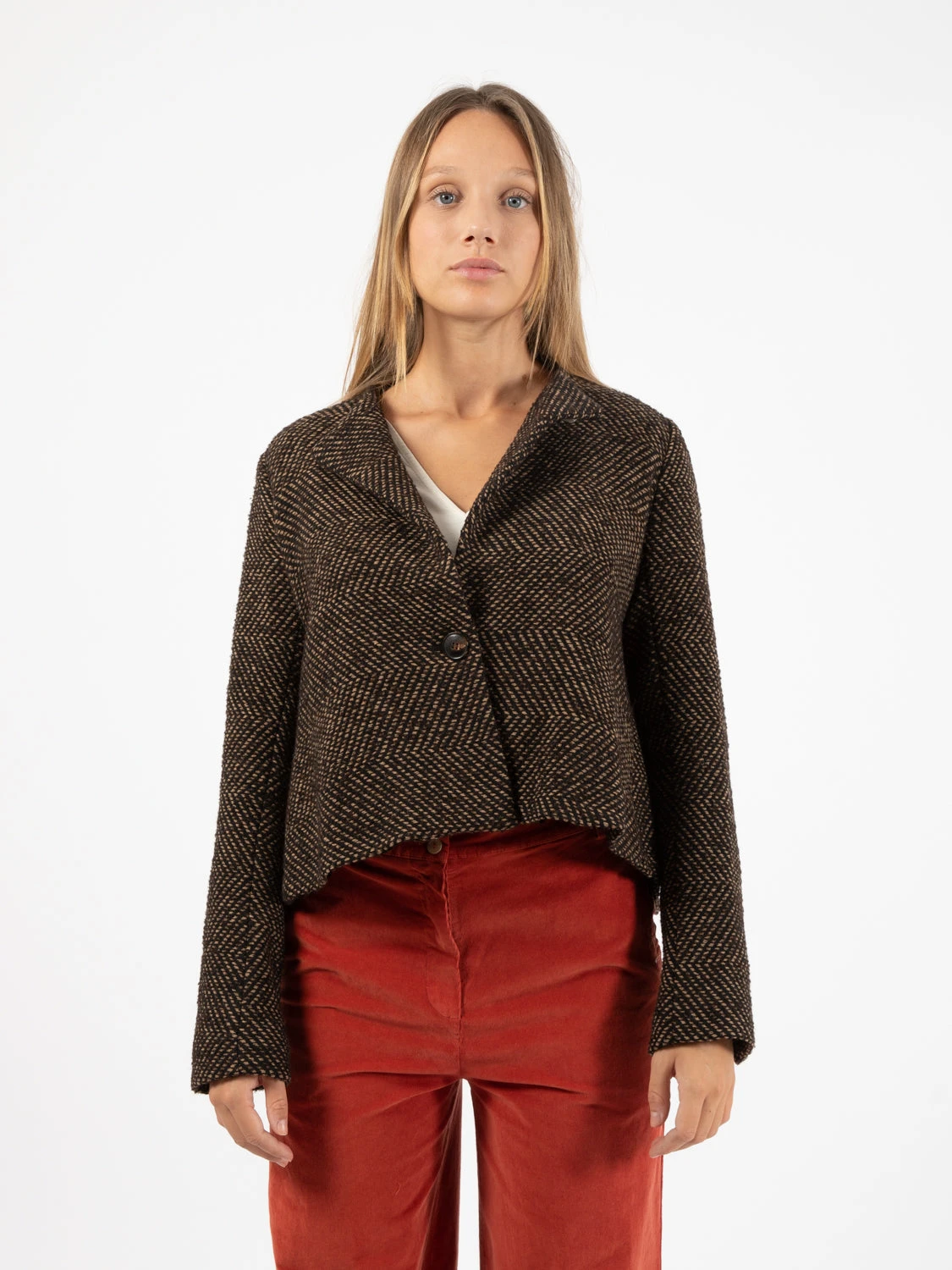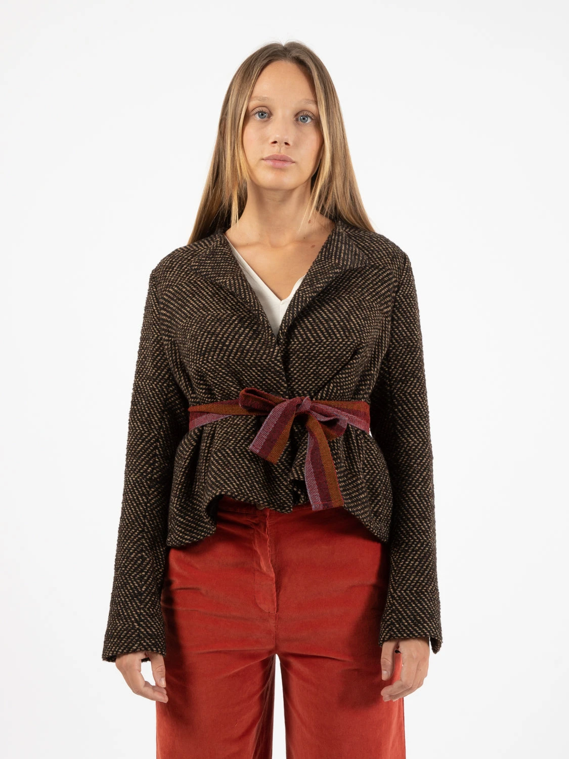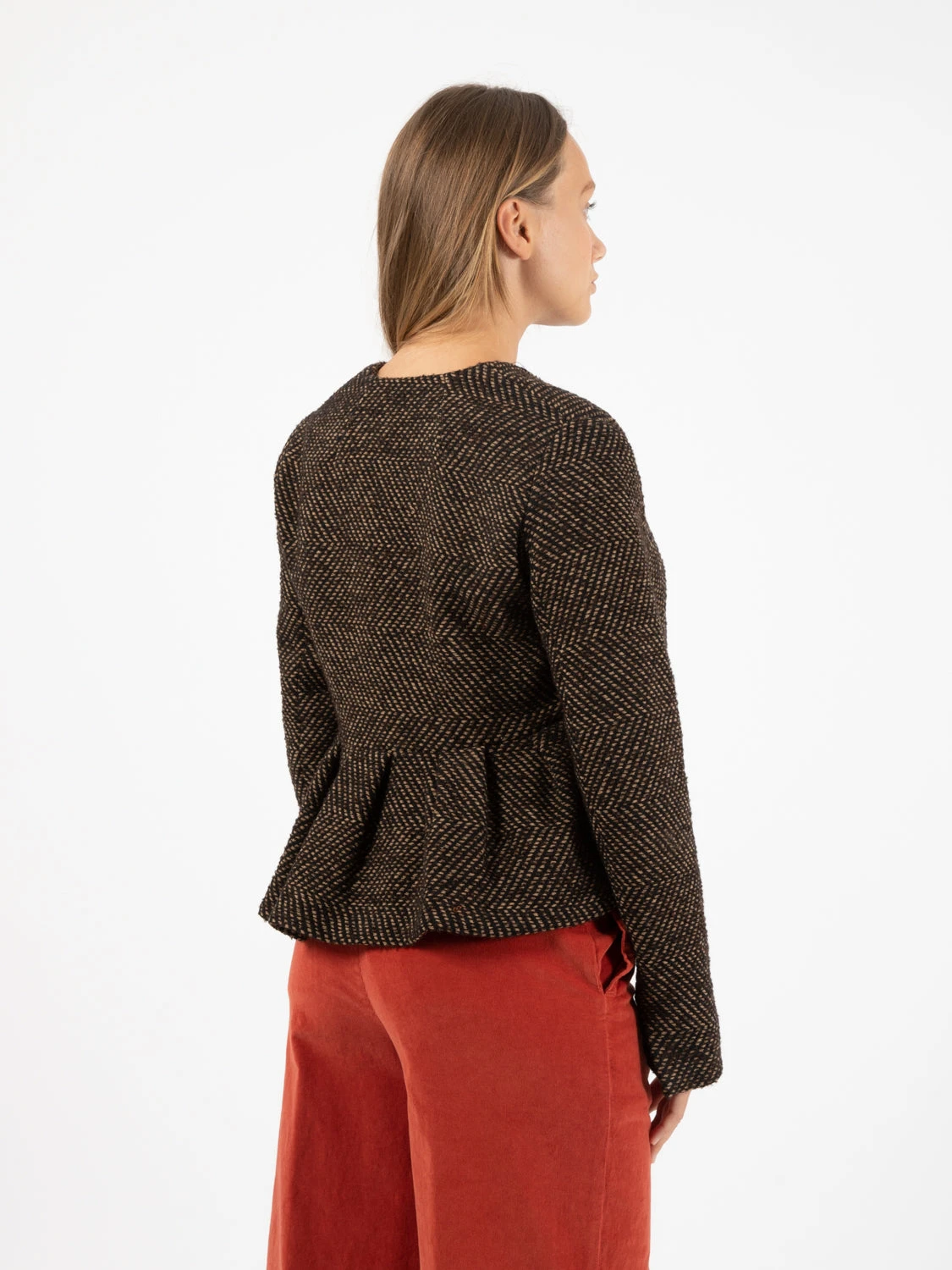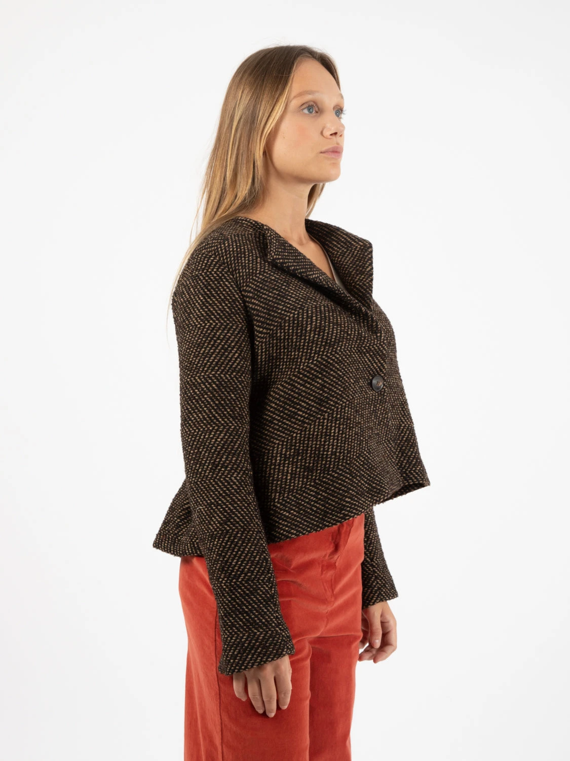 Chiusura con bottone. Dettaglio a balze sul retro.