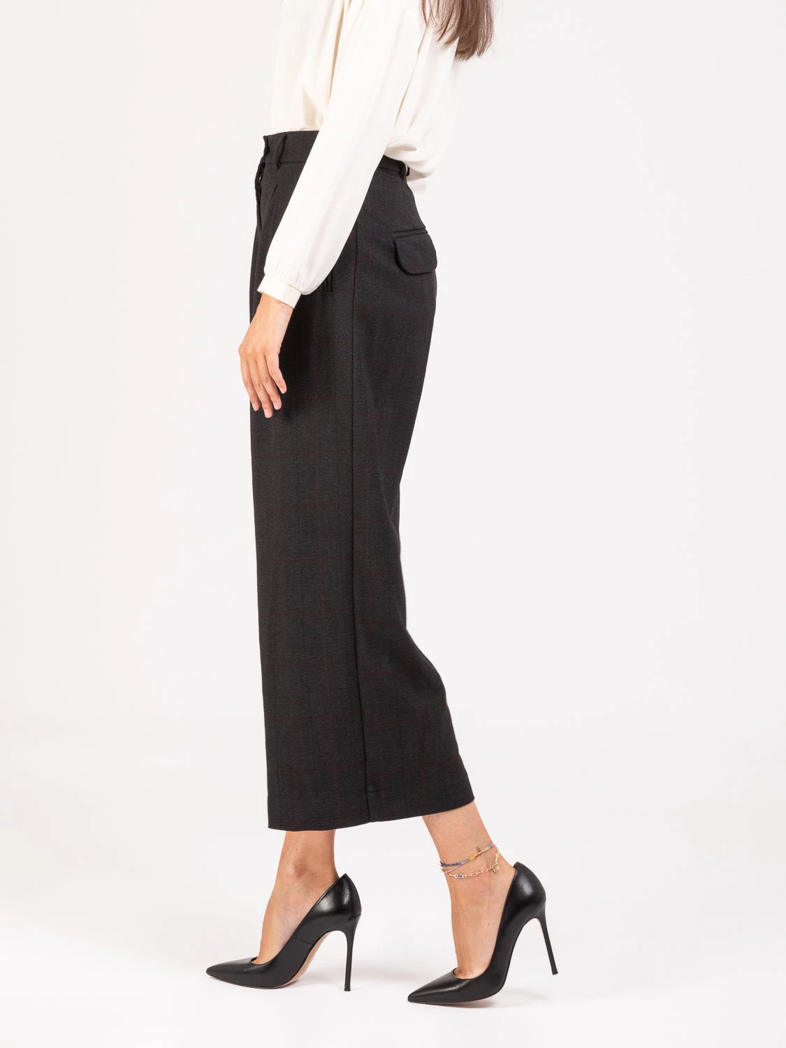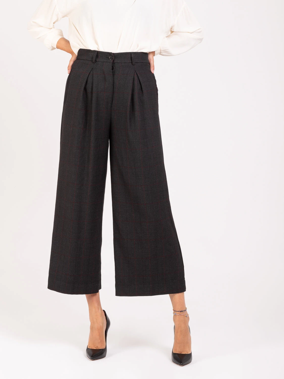 Chiusura con bottone e zip, maxi pinces in vita.