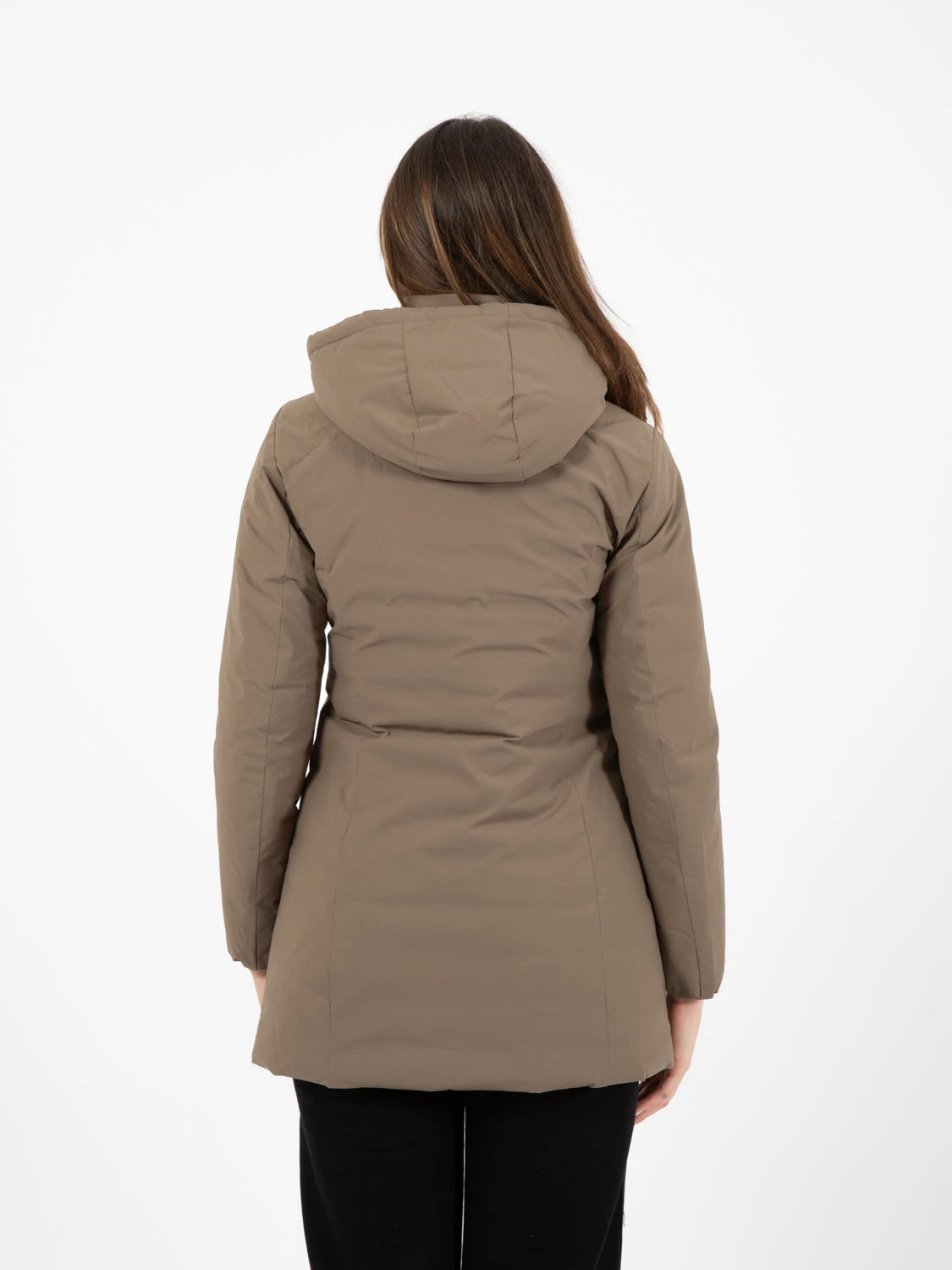 Tessuto in poliestere riciclato con membrana posteriore in poliuretano.