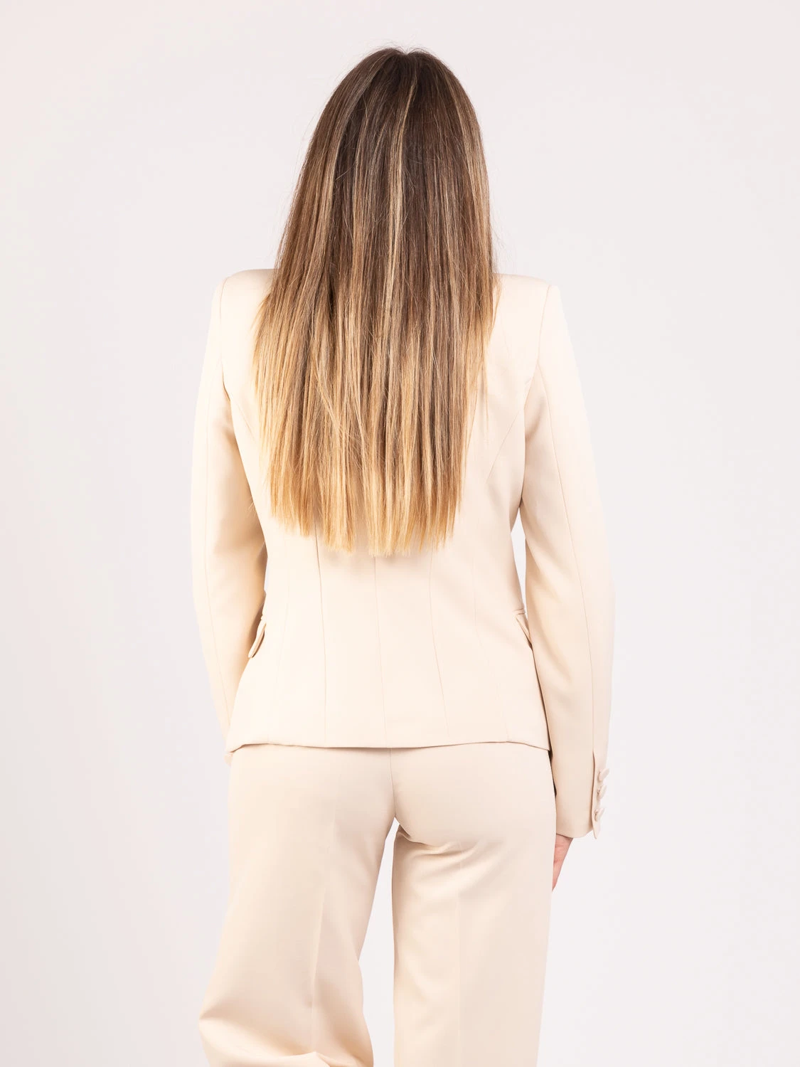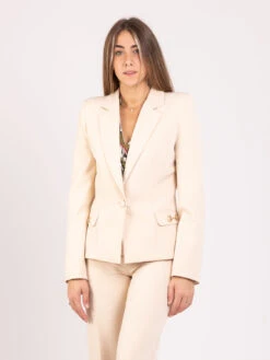 Chiusura single-button, tasche laterali con patta e morsetto oro.