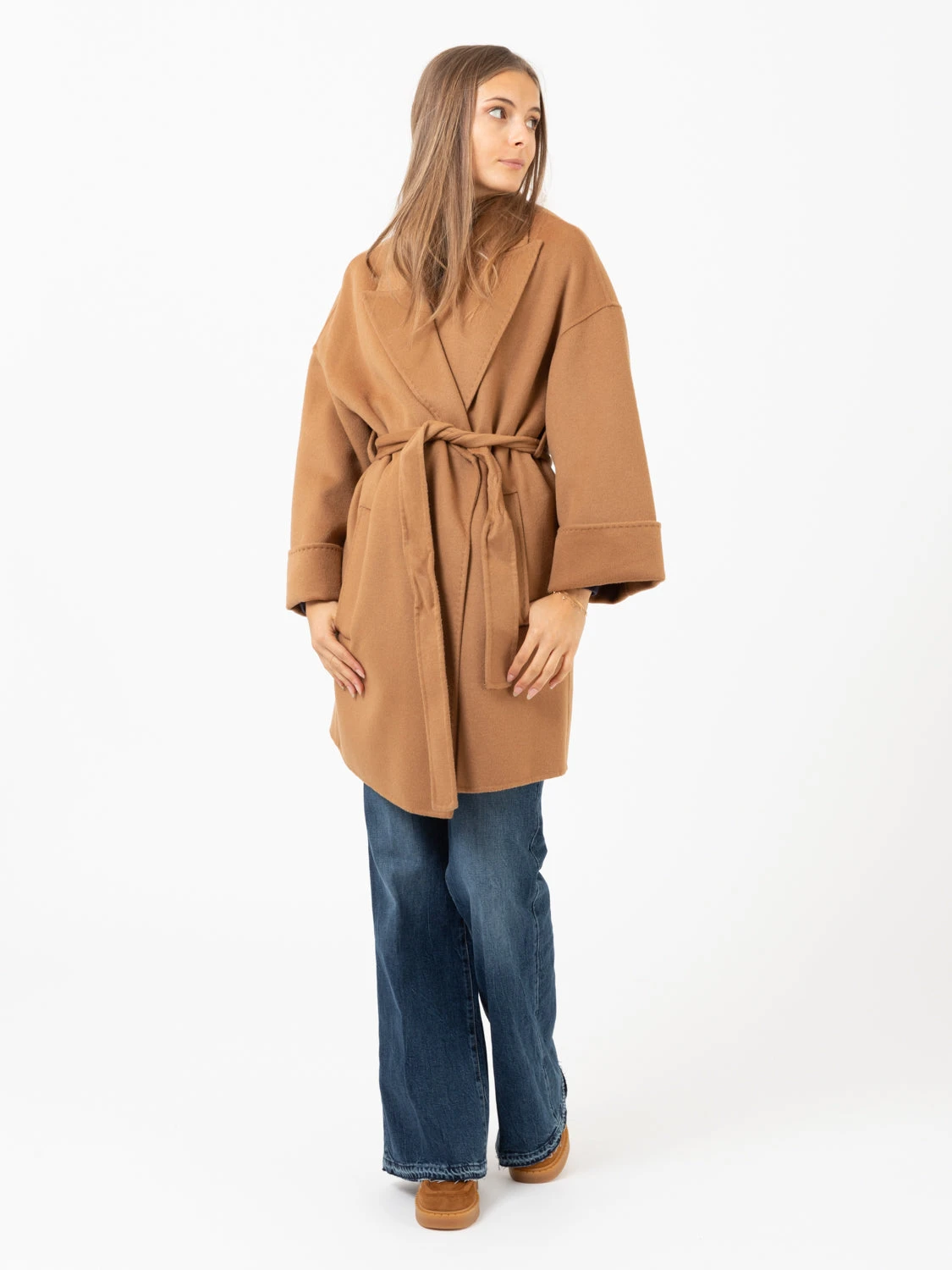 Bavero ampio, maniche lunghe con spalla scesa e maxi risvolto.