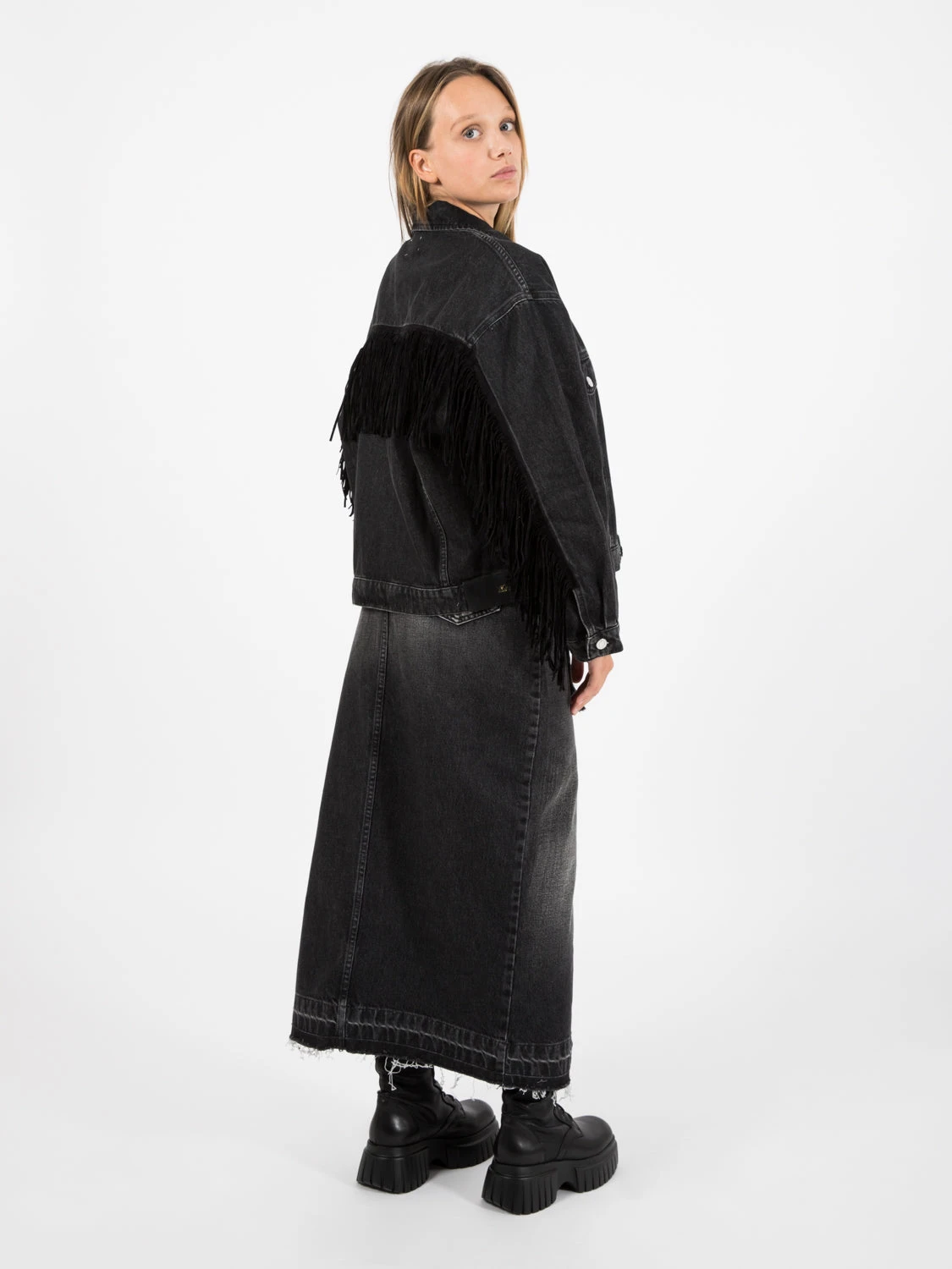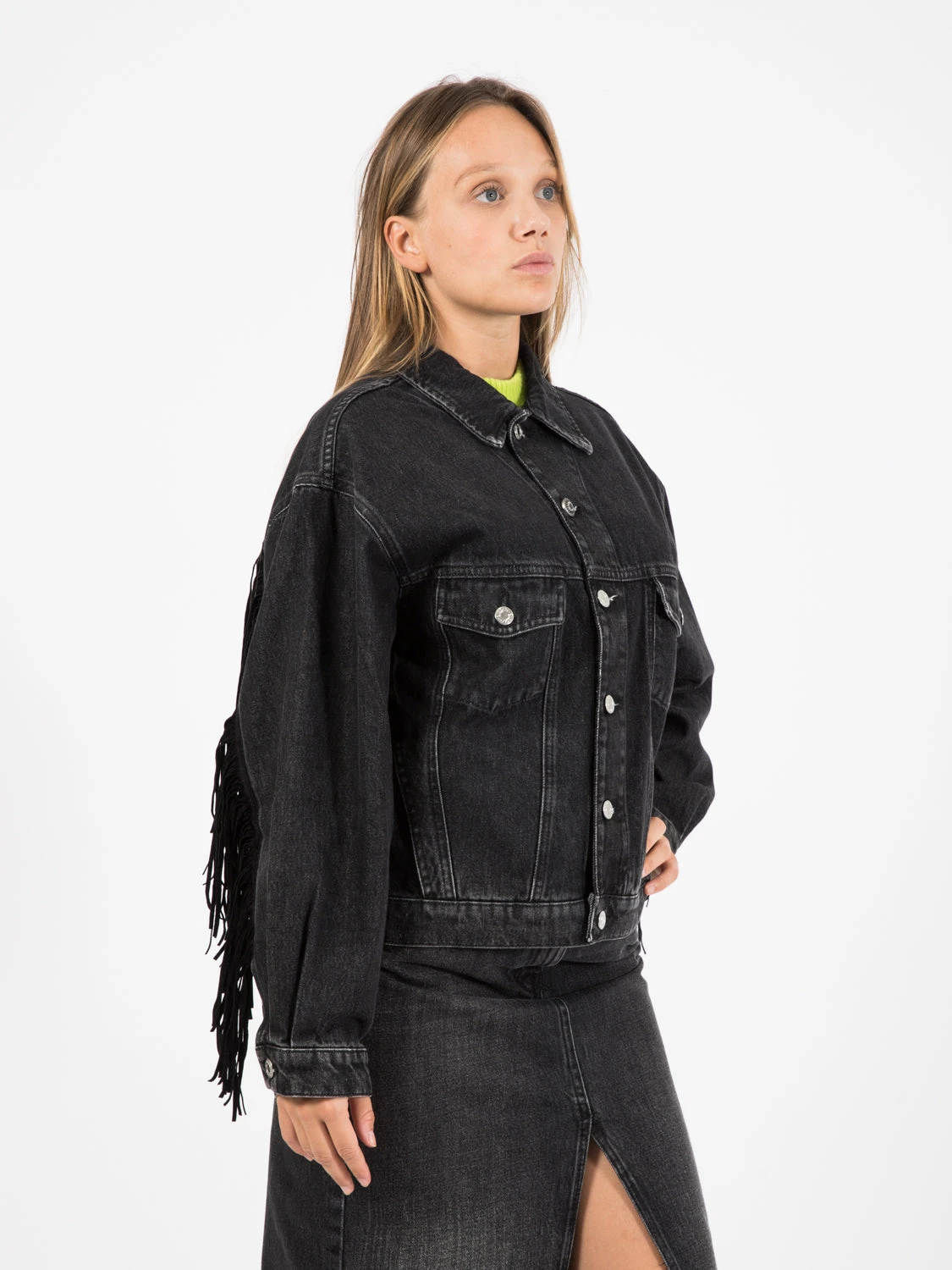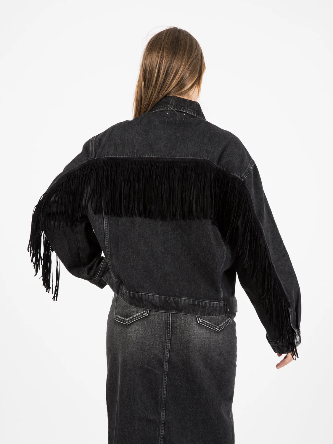 Frange applicate su spalla e maniche nella parte posteriore.